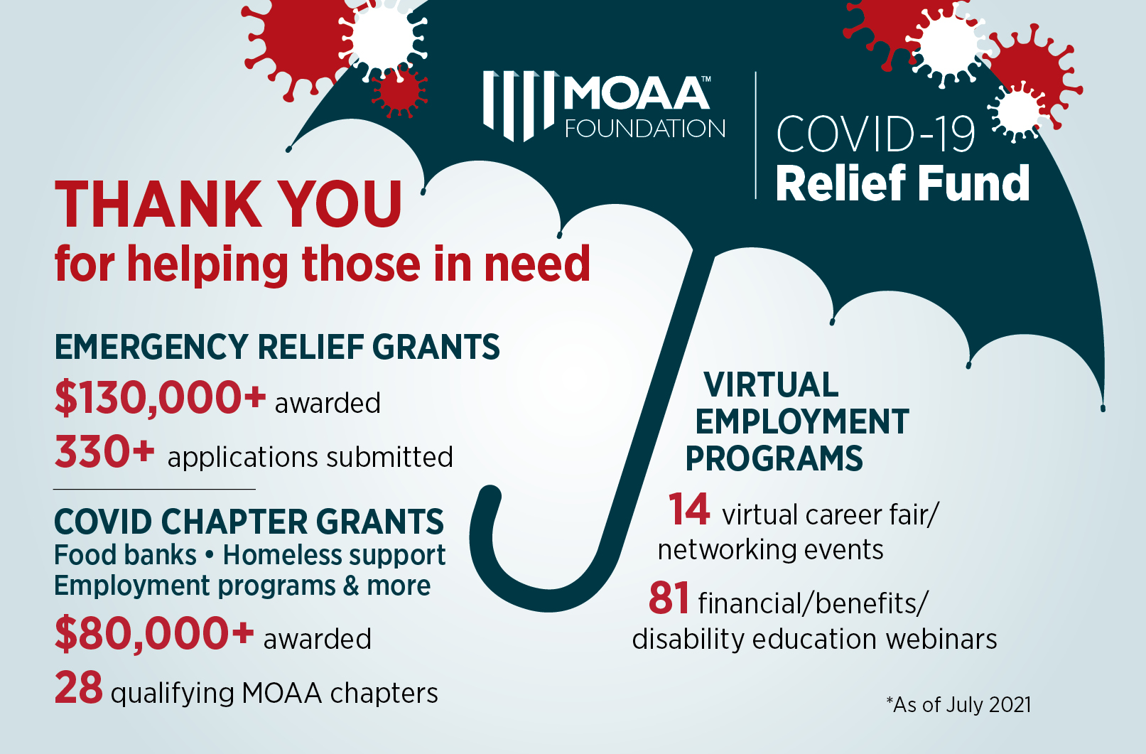 With your generous donations, The MOAA Foundation was able to quickly convert our free, in-person career transition career fairs, webinars, and benefits education classes to all virtual events. We also were able to fund COVID-relief programs offered by MOAA Chapters located all around the country, as well as offer immediate financial relief to those who needed it most.