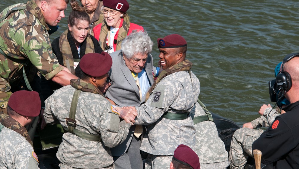82nd Airborne Division paratroopers help World War II veteran James “Maggie” Megellas into an assault boat, Sept. 21, 2014, in Nijmegen, Netherlands, as part of a re-enactment of the crossing of the Waal River that took place during Operation Market Garden in World War II. Megellas parachuted into the Netherlands during the 1944 operation and crossed the river with his troops while under heavy machine gunfire. (Staff Sgt. Mary S. Katzenberger/Army)