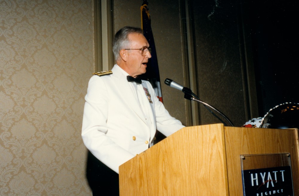 Rear Adm. Harley Nygren speaks during a NOAA Corps event in 1992. (NOAA photo)