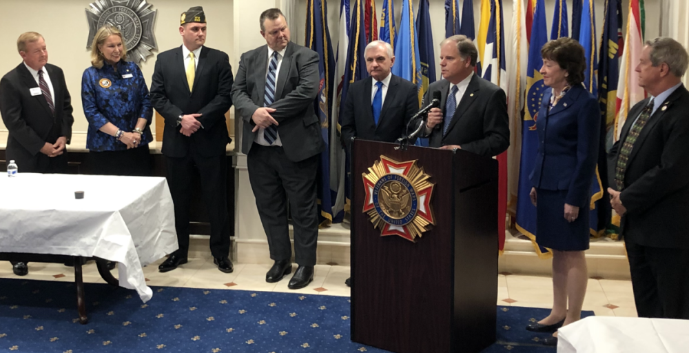 Legislators and veterans advocates, including MOAA President and CEO Lt. Gen. Dana Atkins, USAF (Ret), left, listen as Sen. Doug Jones, D-Ala., speaks during a Dec. 17 event hosted by the Veterans of Foreign Wars in Washington, D.C. (Photo by Dan Merry/MOAA)