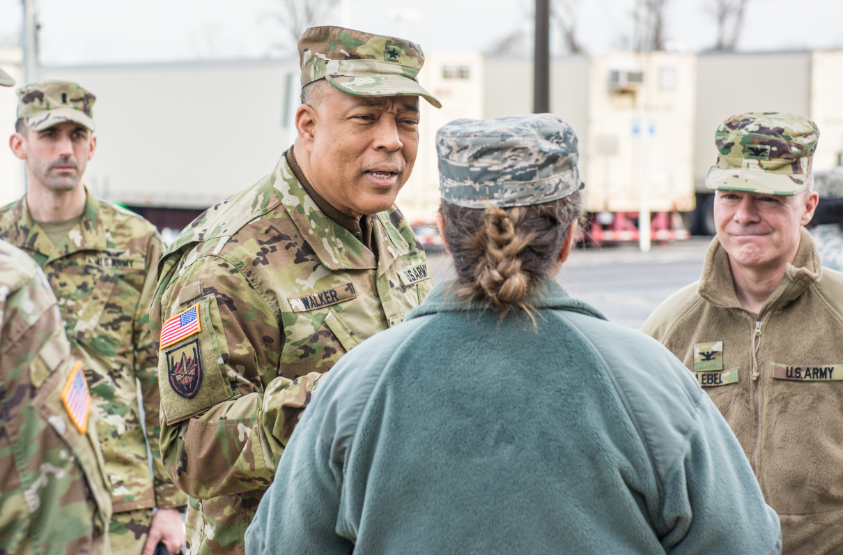Then-Brig. Gen. William Walker, head of the D.C. National Guard, visits soldiers and airmen staying at FedEx Field in support of the 58th Presidential Inauguration in 2017. (Photo by Sgt. Patrick P. Evenson/National Guard)
