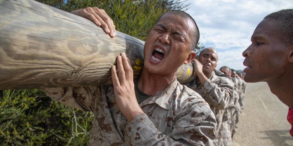 A Marine Corps recruit participates in log drills at Marine Corps Recruit Depot San Diego on Nov. 22, 2021. Drill instructors motivated recruits to complete the exercises. (Photo by Lance Cpl. Julian Elliott-Drouin/Marine Corps