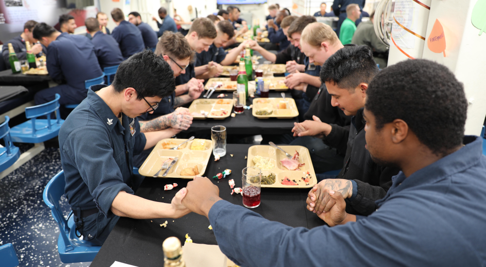 Sailors aboard USS Paul Ignatius (DDG-117) give thanks after their Thanksgiving dinner on Nov. 23. The Arleigh Burke-class guided-missile destroyer is part of the Gerald R. Ford Carrier Strike Group. (Photo by Mass Communication Specialist 1st Class Zac Shea/Navy)