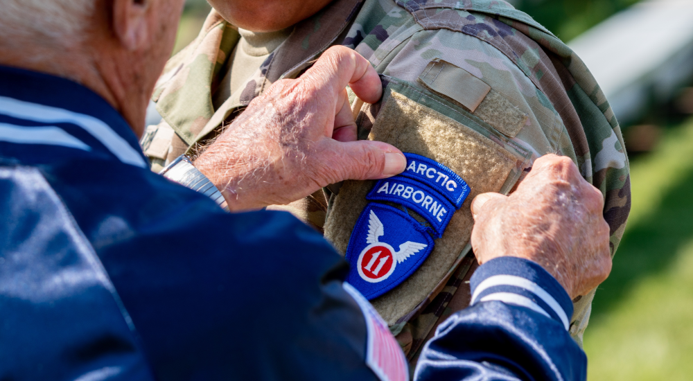 Wayne Porter, an Army veteran who was assigned to the 11th Airborne Division before its deactivation in 1958, places an 11th Airborne Division shoulder sleeve insignia on Spc. Jihad Yarber, assigned to the 2nd Brigade, 11th Airborne Division, during the reflagging ceremony of the 11th Airborne Division on June 6, 2022, at Pershing Parade Field, Joint Base Elmendorf-Richardson, Alaska. (Photo by Senior Airman Patrick Sullivan/Air Force)