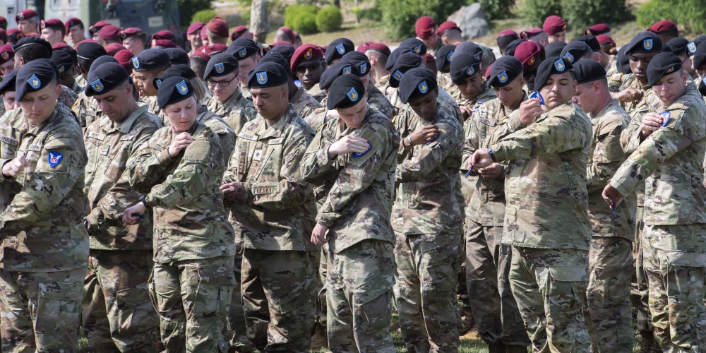 Soldiers place their new Arctic Angels patches on their left shoulders during the activation of the 11th Airborne Division at Pershing Parade Field, Joint Base Elmendorf-Richardson, Alaska, on June 6, 2022. (Photo by Sheila deVere/Air Force)