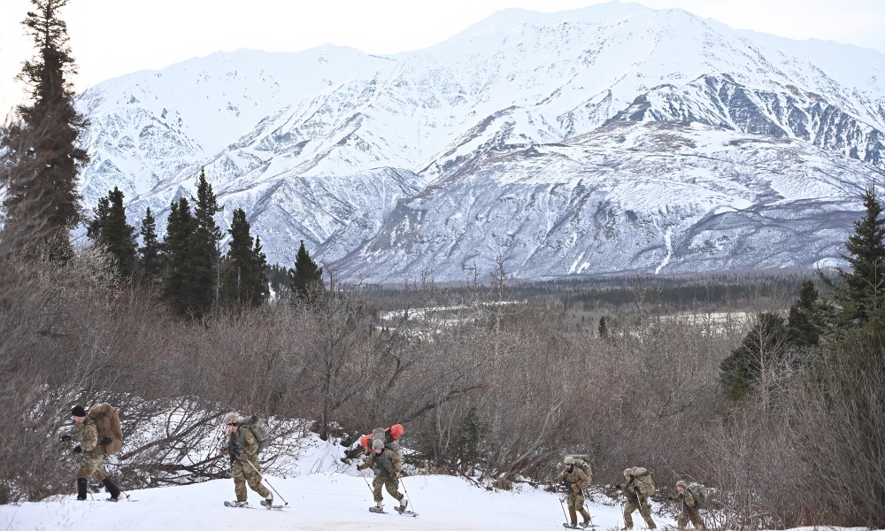 Cold Weather Orientation Course students from the 11th Airborne Division head out for a snowshoe trek during training at the Northern Warfare Training Center’s Black Rapids Training Site. (Photo by John Pennell/Army)