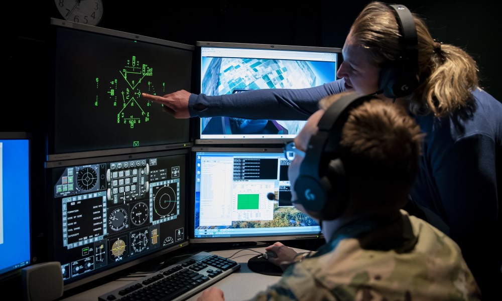 Air Force Research Laboratory staff watch while a pilot uses the automatic ground collision avoidance system (Auto-GCAS) in a flight simulator. (Photo by Richard Eldridge/Air Force)