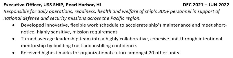 As a uniformed professional or military spouse, you can do a long list of things. Instead of trying to cram all of them into two pages, showcase what you want to do in your next role.