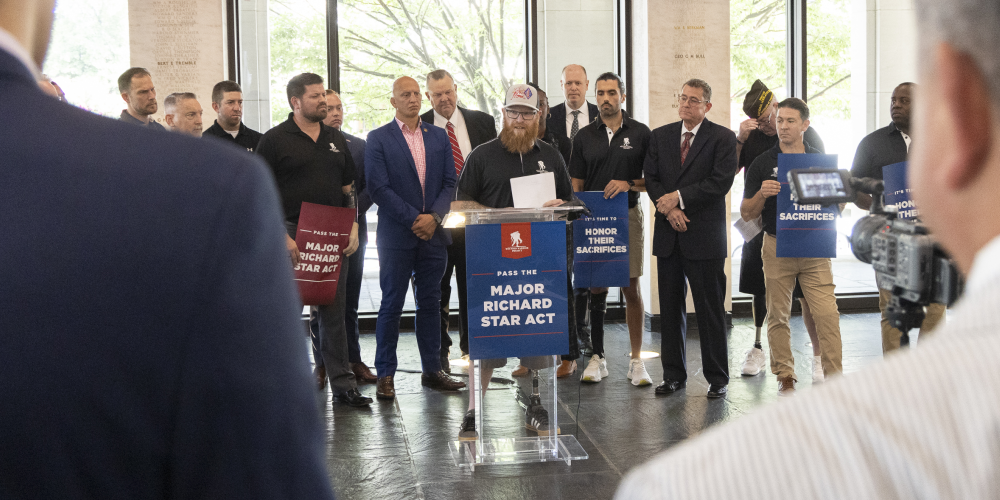 Belinsky delivered remarks at a press conference at Reserve Organization of America headquarters alongside fellow advocates, injured veterans, and Senate Veterans’ Affairs Committee Chairman Sen. Jon Tester (D-Mont.), who has staunchly supported the bipartisan Major Richard Star Act.
