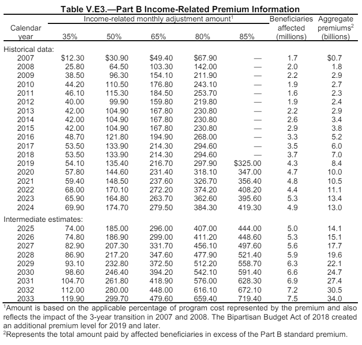 - The income levels for 2025 in that bracket will rise depending on inflation, but those in the bracket that year (based on 2023 income levels) will pay an additional $74 a month (estimated) on top of their estimated $185 standard premium, for a $259 monthly total.
