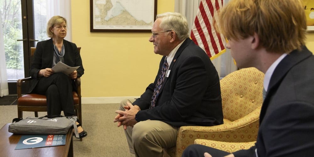 MOAA Wisconsin Council of Chapters President Lt. Col. Don Korte Jr., USA (Ret), center, meets with Sen. Tammy Baldwin (D-Wis.) in Washington, D.C., on April 17 as part of MOAA’s Advocacy in Action event. (Photo by Mike Morones/MOAA)