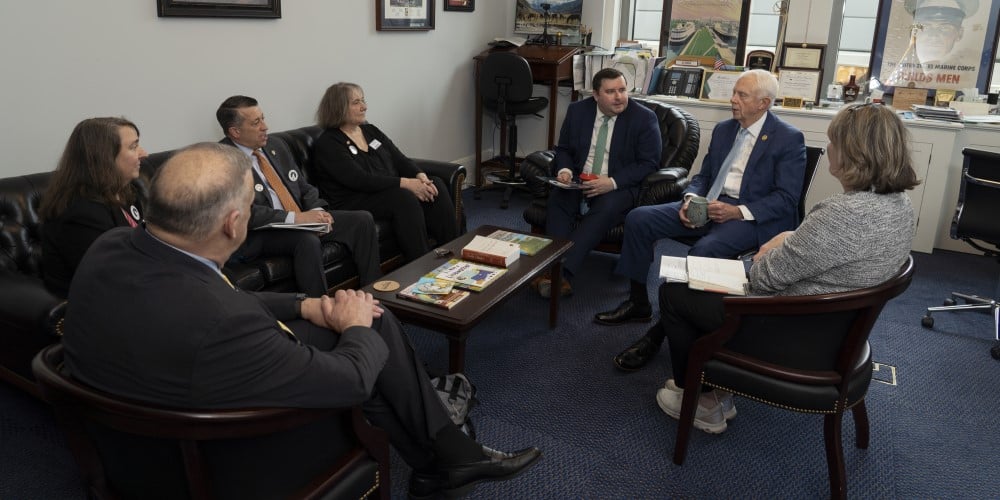 MOAA leadership, staff, and members visit with Rep. Jack Bergman (R-Mich.), second from right, during MOAA’s Advocacy in Action event April 17 in Washington, D.C. (Photo by Sean Shanahan/MOAA)