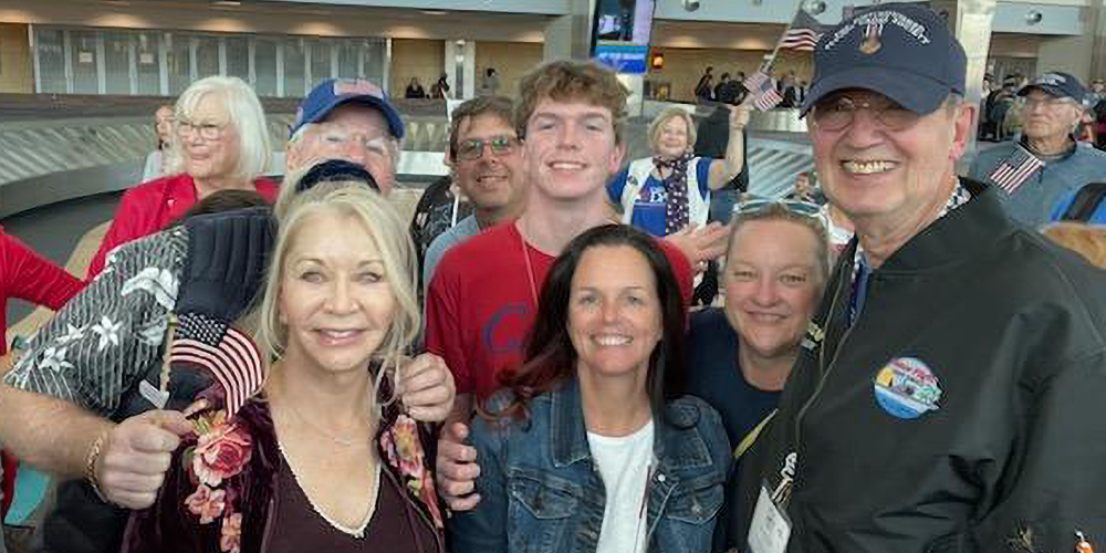 Col. J. Gunnar Schalin, USA (Ret), far right, a member of the Miramar (Calif.) Chapter, is welcomed home from his Honor Flight trip by family and friends. (Courtesy photo)
