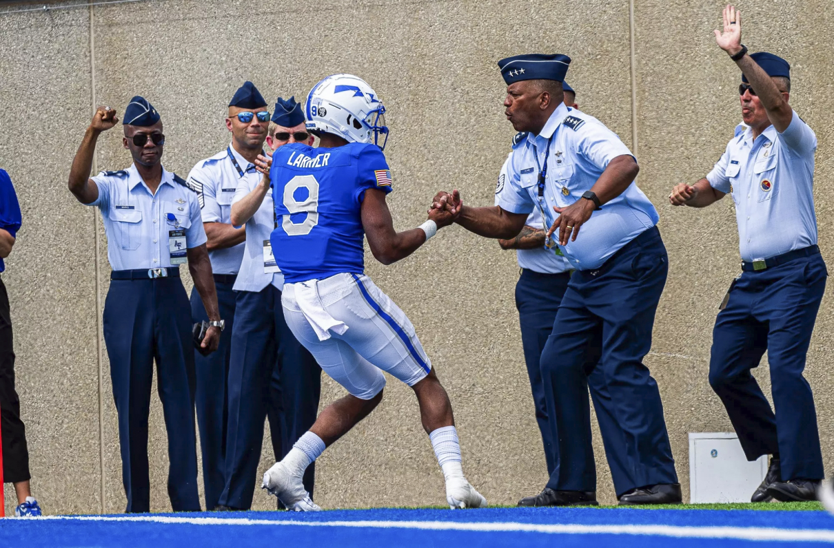 Air Force's Zac Larrier celebrates with then-Air Force Academy Superintendent Lt. Gen. Richard M. Clark after scoring a touchdown against Robert Morris University on Sept. 2, 2023. (Photo by Trevor Cokley/Air Force)