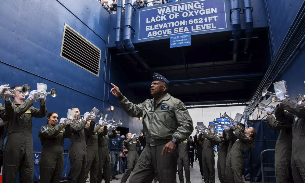 The Air Force Academy Band hypes up fans with then-superintendent Clark before a 2023 football game. (Photo by Rayna Grace/Air Force)