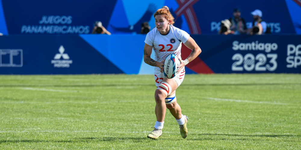Army 1st. Lt. Sammy Sullivan runs upfield during the U.S. Women's Rugby 7s team's gold medal match against Canada on Nov. 4, 2023, in the Pan American Games in Santiago, Chile. Sullivan helped the U.S. team win the gold medal. (Photo by Maj. Nate Garcia/Army)