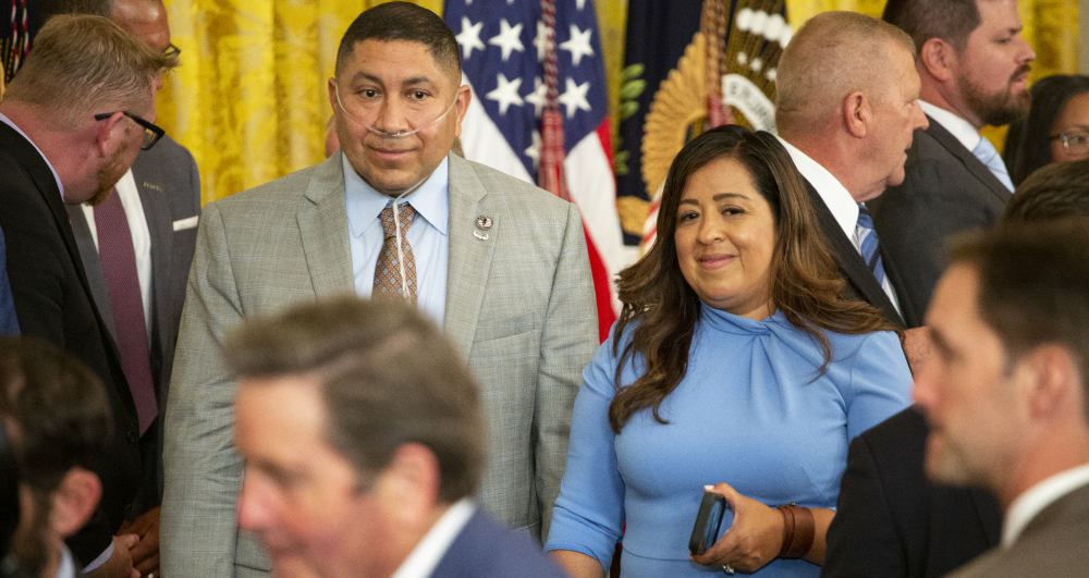 Burn Pits 360 cofounder Rosie Torres, right, and husband Le Roy attend the signing of the Sergeant First Class Heath Robinson Honoring our Promises to Address Comprehensive Toxics (PACT) Act at the White House on Aug. 10, 2022. (Mike Morones/MOAA)