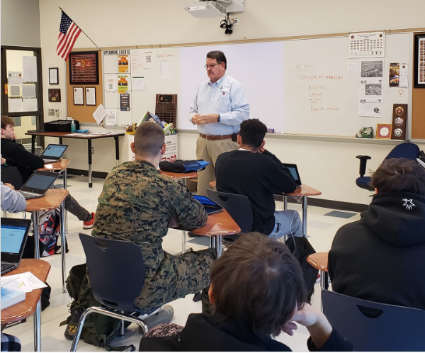 Major Gary M. Portnoy, USAFR (Ret), of MOAA's Willow Grove Chapter briefs junior ROTC cadets at nearby Bensalem High School on MOAA and opportunities in the Air Force. (Willow Grove Chapter via Instagram)