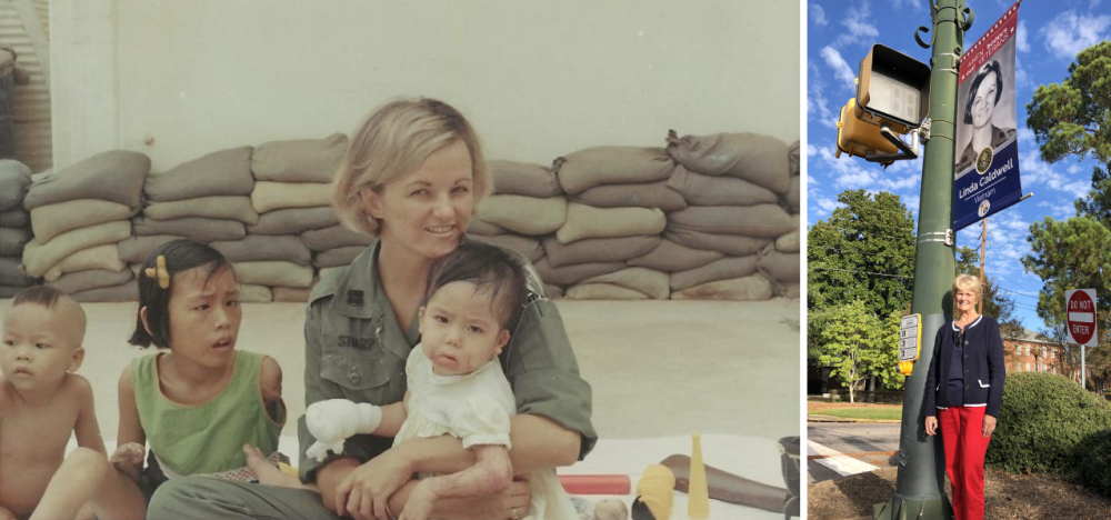 Former Army Capt. Linda Sharp Caldwell served as a nurse in Vietnam, left. Her effort to honor veterans led to hundreds of banners being raised in two towns. (Photos courtesy of Linda Sharp Caldwell)