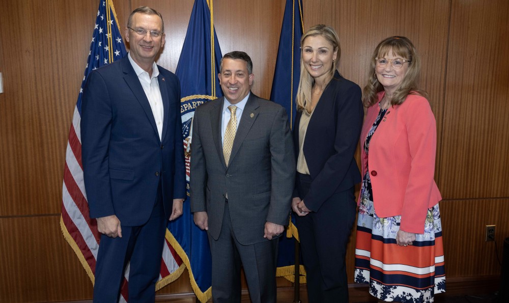 VA Secretary Doug Collins poses with MOAA President and CEO Lt. Gen. Brian T. Kelly, USAF (Ret), Vice President for Government Relations Maj. Gen. April Vogel, USAF (Ret), and Senior Director of Government Relations Cmdr. René Campos, USN (Ret).